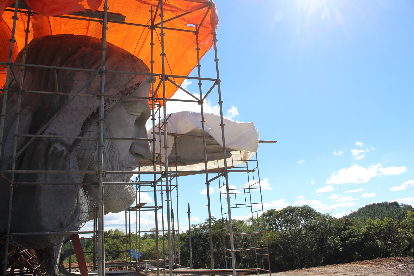 O escultor Markus Moura e a equipe trabalham na construção dos braços e na modelagem da face. Após a conclusão, estas partes do monumento serão içadas com dois guindastes até o topo. A ousada obra do iniciou em julho de 2019. Em função da pandemia, ficou parada por cerca de seis meses entre março e setembro de 2020.