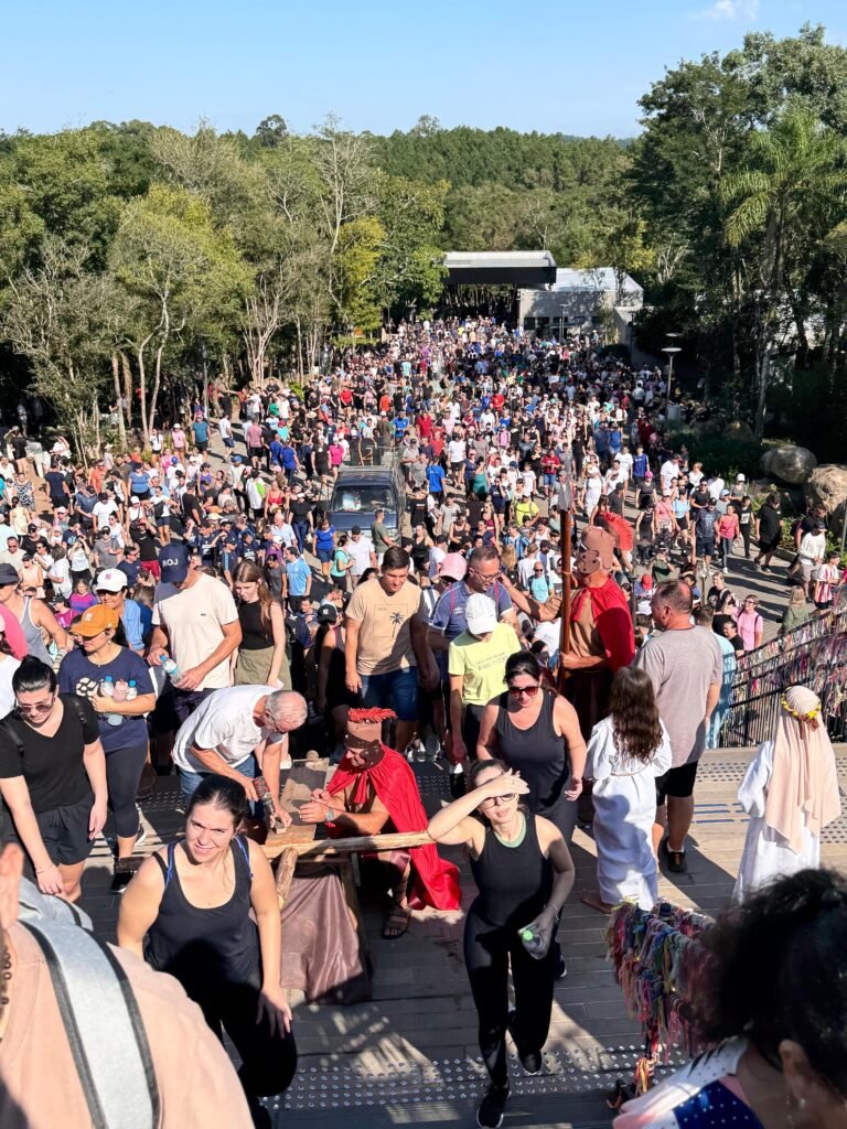 A caminhada seguiu em direção ao Boulevard de Encantado. Já na estrada de acesso ao Cristo, teve início a Via Sacra, prática tradicional da fé cristã que relembra, em 14 estações, os momentos da paixão e morte de Jesus Cristo, desde a sua condenação até a crucificação e sepultamento.